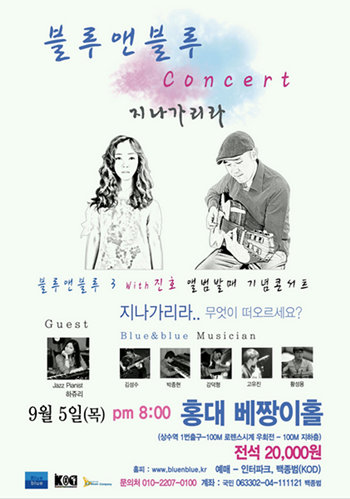 지난달 여성보컬리스트 진호와 함께 3집 <지나가리라>를 발매한 블루앤블루가 오는 9월 5일(목) 동명 타이틀의 콘서트를 열고 아름다운 무대를 꾸민다.